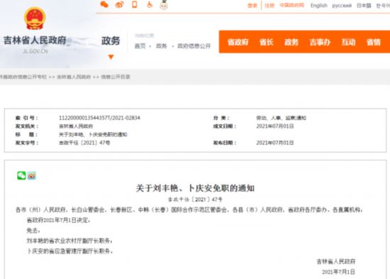 7月1日,記者從吉林省人民政府網站(http://www.jl.gov.cn/)了解到,吉林省政府2021年7月1日決定:免去:劉豐艷的省農業農村廳副廳長職務;卜慶安的省應急管理廳副廳長職務。(記者李易書)