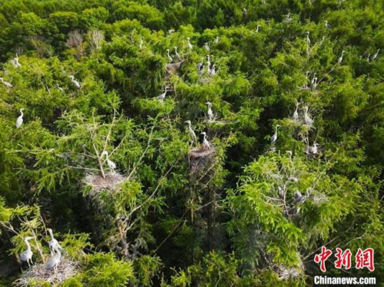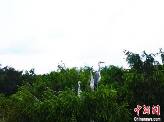夏日的“鷺島”林蔭蔽日,在臨水的松林,蒼鷺群棲落枝頭,時而展翅躍動,時而眺望遠方。(記者蒼雁 石洪宇)