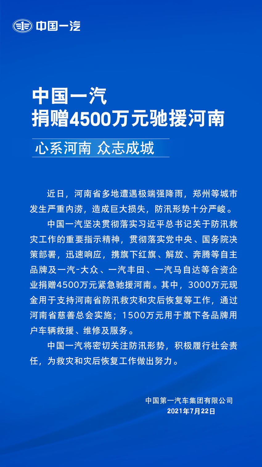 中國一汽堅決貫徹落實習近平總書記關于防汛救災工作的重要指示精神,貫徹落實黨中央、國務院決策部署,迅速響應,攜旗下紅旗、解放、奔騰等自主品牌及一汽-大眾、一汽豐田、一汽馬自達等合資企業捐贈4500萬元緊急馳援河南。其中,3000萬元現金用于支持河南省防汛救災和災后恢復等工作,通過河南省慈善總會實施;1500萬元用于旗下各品牌用戶車輛救援、維修及服務。