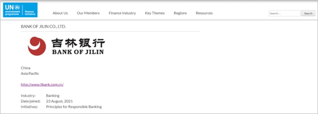 2021年8月23日,吉林銀行簽署聯合國《負責任銀行原則》(PRB,Principles for Responsible Banking),正式加入聯合國環境規劃署金融倡議(UNEP FI)。目前,中國地區簽署PRB的銀行僅14家。成為東北地區首家簽署《負責任銀行原則》的銀行。