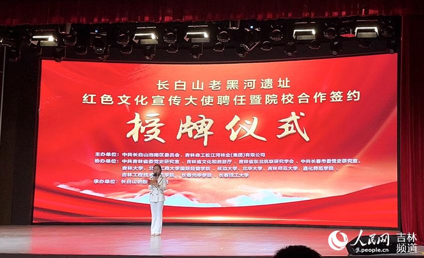 人民網長白山9月19日電 (李思玥)17日下午,長白山老黑河遺址紅色文化宣傳大使聘任暨院校合作簽約授牌儀式在長白山池南區訥殷演藝中心舉行。