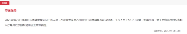 9月13日,吉林市醫保局再次對網友的問題進行回復:“2021年9月9日凌晨4時35份,患者家屬詢問工作人員,在深圳龍崗中心醫院的門診費用是否可以報銷,工作人員于當日5時15分回復,如確診后,對于患病部位的檢查和治療是可以按照報銷比例正常報銷的!
