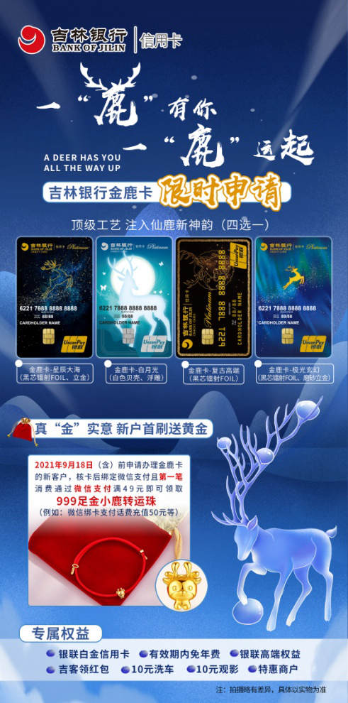 吉林銀行此次發行金鹿信用卡,創新亮點紛呈。從產品創意上挖掘設計元素,以吉林銀行的吉祥物鹿為主題,推出星辰大海、白月光、復古高端、極光玄幻四種版面,運用黑芯FOIL、立金、浮雕等工藝彰顯卡面質感,使信用卡品牌形象更顯立體、更具內涵;從新戶首刷禮上,新客戶滿足消費條件后即可領取足金小鹿轉運珠,既打破傳統的產品策略和禮品模式,也賦予卡片獨具特色的“一鹿運起”美好寓意。