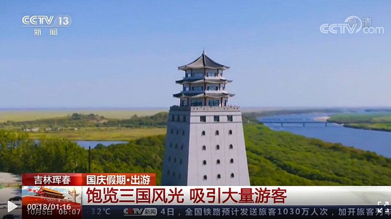 10月5日CCTV-13新聞頻道播出的《朝聞天下》欄目關注報道了琿春旅游。今年“十一”期間,琿春再次迎來旅游高峰,q春防川景區因剛好處于中國、朝鮮、俄羅斯交界地帶,登臨高處,可以一眼飽覽三國風光,每年都吸引大批游客前來。