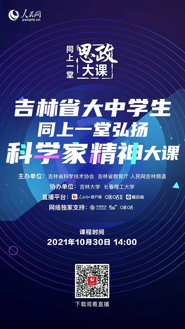 本次“思政大課”由吉林省科學技術協會、吉林省教育廳、人民網吉林頻道主辦,吉林大學、長春理工大學協辦,中國移動、咪咕提供網絡支持,屆時與您網絡相會。