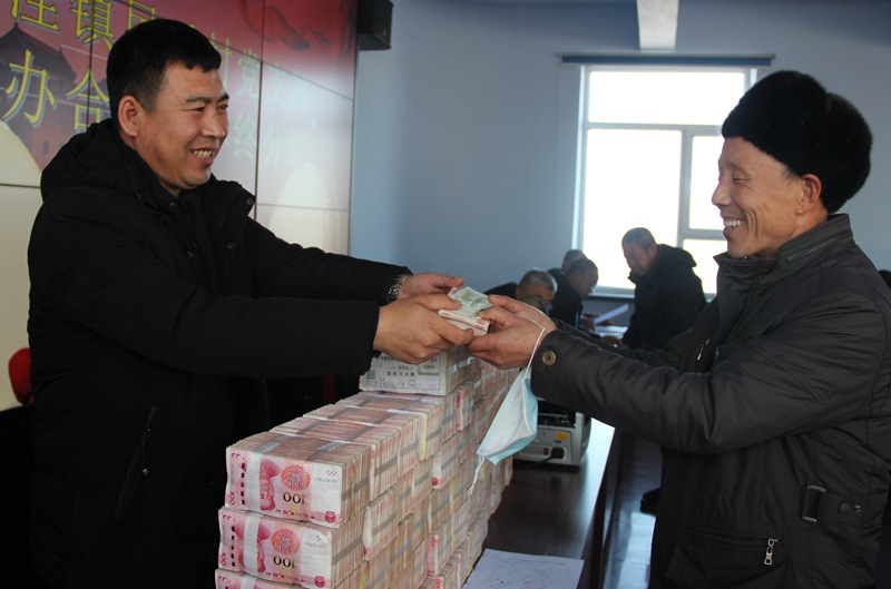 “合作社分紅啦!”11月26日,大洼鎮民樂村會議室的桌子上整整齊齊地擺放著一捆捆現金,民樂村黨支部領辦合作社在這里向入股的農戶進行年終分紅,大家個個喜笑顏開,在分紅款發放名單上簽名、摁手印,一派熱鬧景象。