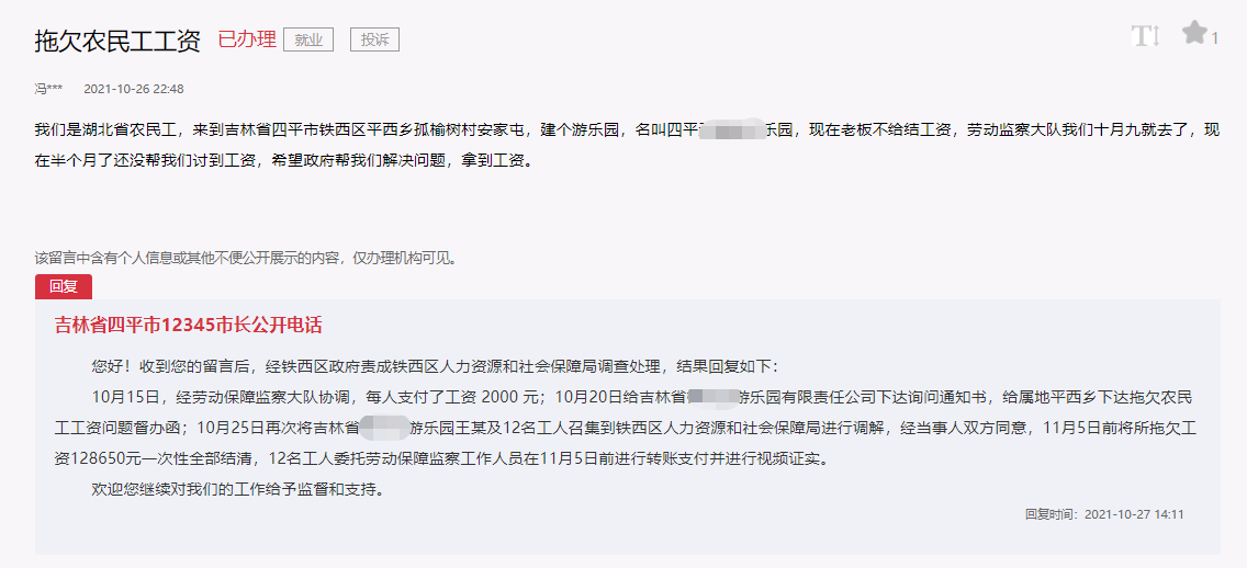 針對該留言,吉林省四平市鐵西區政府責成鐵西區人力資源和社會保障局進行調查處理后回復網友留言。10月15日,經勞動保障監察大隊協調,給每人支付了工資 2000 元;10月20日給游樂園下達詢問通知書,給屬地平西鄉下達拖欠農民工工資問題督辦函;10月25日再次將游樂園負責人及12名工人召集到鐵西區人力資源和社會保障局進行調解,經當事人雙方同意,11月5日前將所拖欠工資128650元一次性全部結清,12名工人委托勞動保障監察工作人員在11月5日前進行轉賬支付并進行視頻證實。