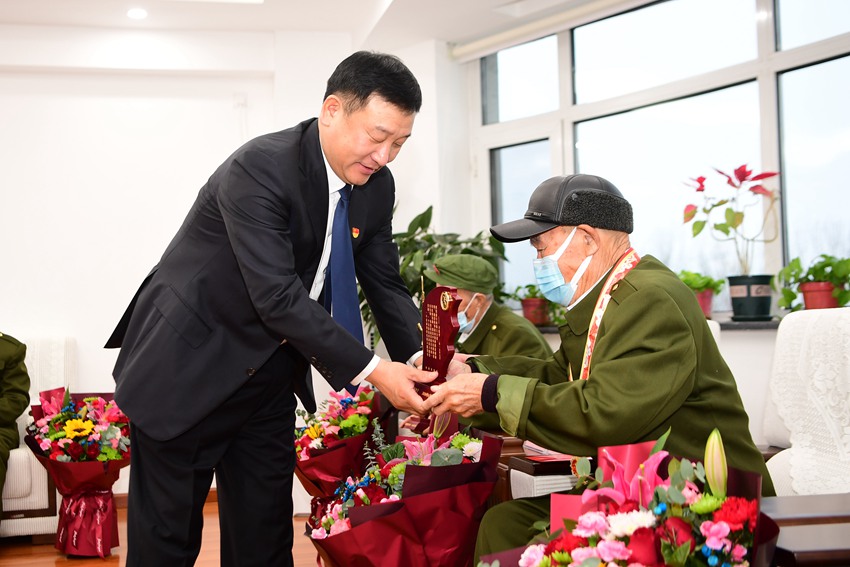 吉林省退役軍人事務廳廳長黎海濱向在鄉老復員軍人代表贈送榮譽激勵牌
