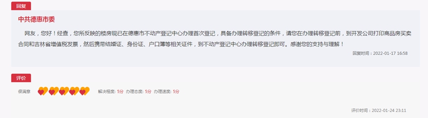 1月17日,中共德惠市委回復:經查,您所反映的樓房現已在德惠市不動產登記中心辦理首次登記,具備辦理轉移登記的條件,請您在辦理轉移登記前,到開發公司打印商品房買賣合同和吉林省增值稅發票,然后攜帶結婚證、身份證、戶口簿等相關證件,到不動產登記中心辦理轉移登記即可。感謝您的支持與理解!