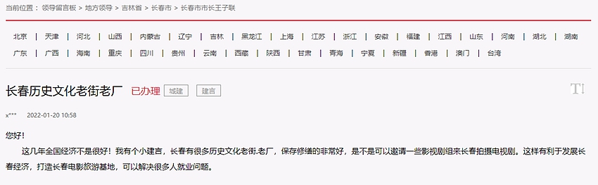 “長春有很多歷史文化老街、老廠,保存修繕得非常好,是不是可以邀請一些影視劇組來長春拍攝電視劇。這樣有利于發展長春經濟,打造長春電影旅游基地,可以解決很多人就業問題!痹摼W友寫道。