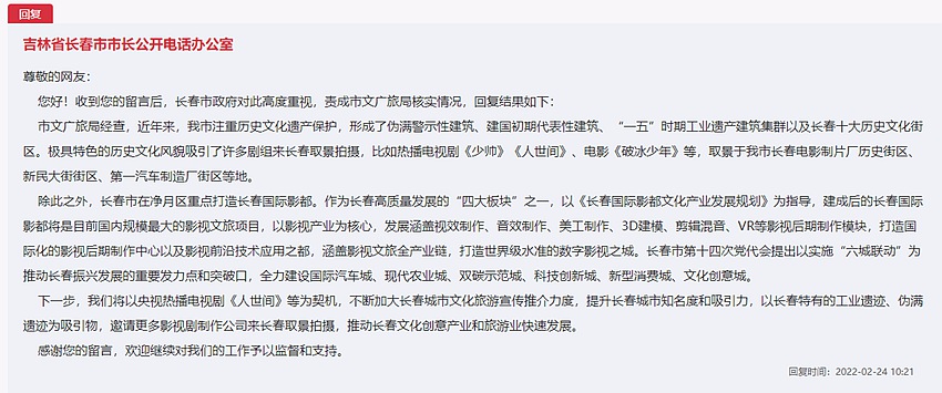 長春市文廣旅局在回復中表示,近年來,長春市注重歷史文化遺產保護,形成了偽滿警示性建筑、建國初期代表性建筑、“一五”時期工業遺產建筑集群以及長春十大歷史文化街區。極具特色的歷史文化風貌吸引了許多劇組來長春取景拍攝,比如熱播電視劇《少帥》《人世間》、電影《破冰少年》等,取景于長春市長春電影制片廠歷史街區、新民大街街區、第一汽車制造廠街區等地。