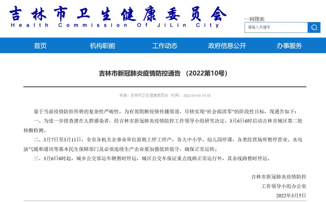 據吉林市新冠肺炎疫情防控工作領導小組辦公室發布的《吉林市新冠肺炎疫情防控通告 (2022第10號)》顯示,吉林市將于3月6日6時啟動吉林市城區第二輪核酸檢測,城鄉公交客運車輛暫時停運,城區公交車保證重點線路正常運行外,其余線路暫時停運;3月7日至3月11日,全市各機關企事業單位原則上停工停產,各大中小學、幼兒園停課,各類經營場所暫停營業。以下為通告全文: