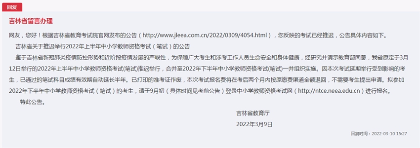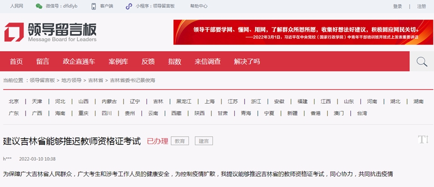 近日,由于新冠肺炎疫情形勢嚴峻,吉林省多個城市被按下了“暫停鍵”。3月10日,一位網友在人民網“領導留言板”留言,建議推遲吉林省的教師資格證考試。