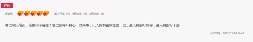 對此,該網友為該留言回復送上了滿分好評,并表示,考試可以推遲,疫情刻不容緩!各位領導聽民心,辦民事,以人民利益放在第一位,是人民的好領導,是人民的好干部。