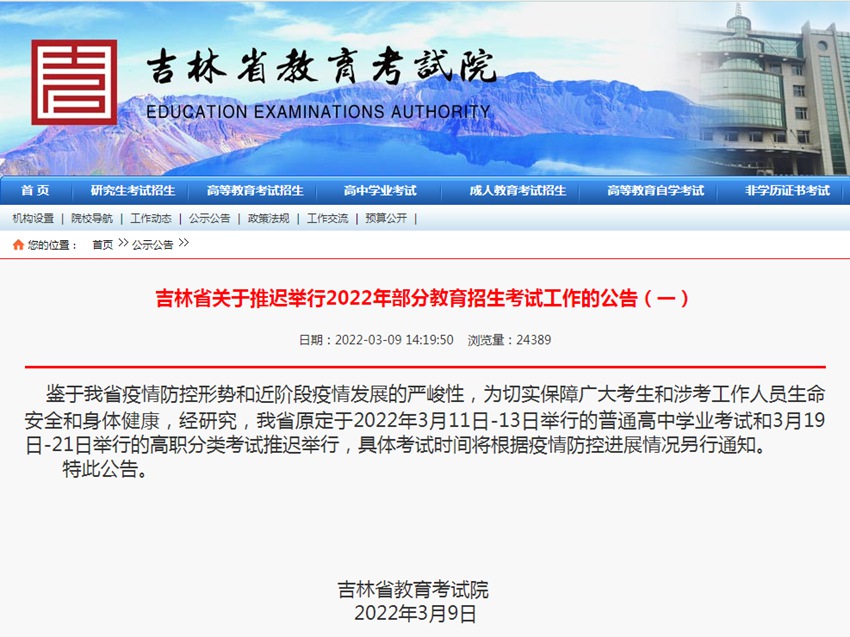 3月9日,吉林省教育考試院發布《吉林省關于推遲舉行2022年部分教育招生考試工作的公告(一)》,原定于2022年3月11日-13日舉行的普通高中學業考試和3月19日-21日舉行的高職分類考試推遲舉行,具體考試時間將根據疫情防控進展情況另行通知。