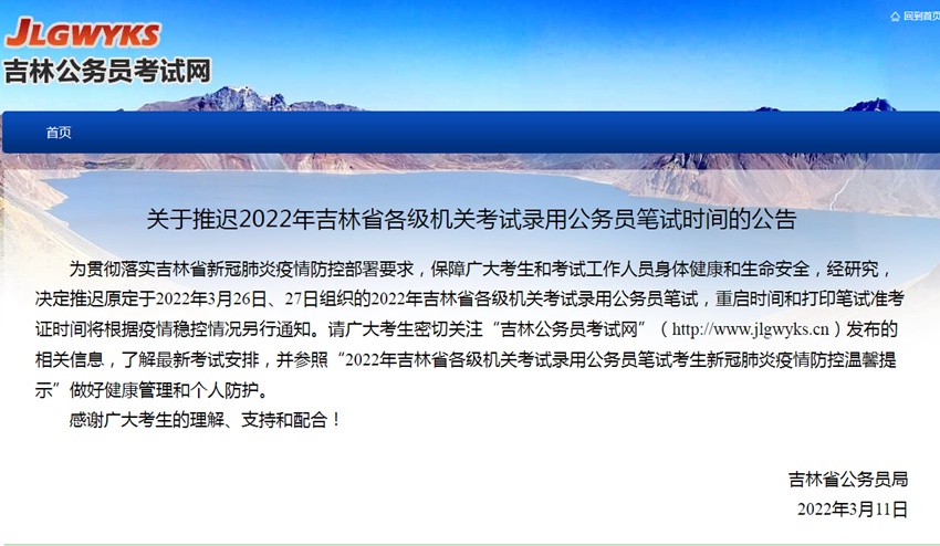 《關于推遲2022年吉林省各級機關考試錄用公務員筆試時間的公告》