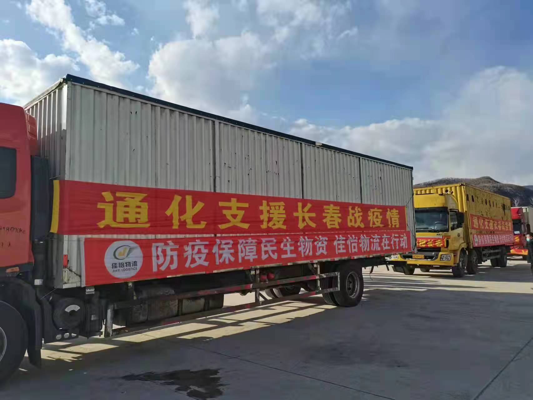“黃瓜、茄子、土豆、西紅柿、西藍花、胡蘿卜、芹菜……”隨著汽笛聲響,26日下午,一輛輛滿載著蔬菜的貨車從通化市駛向長春,車身上掛著紅色標語“通化支援長春戰疫情”。