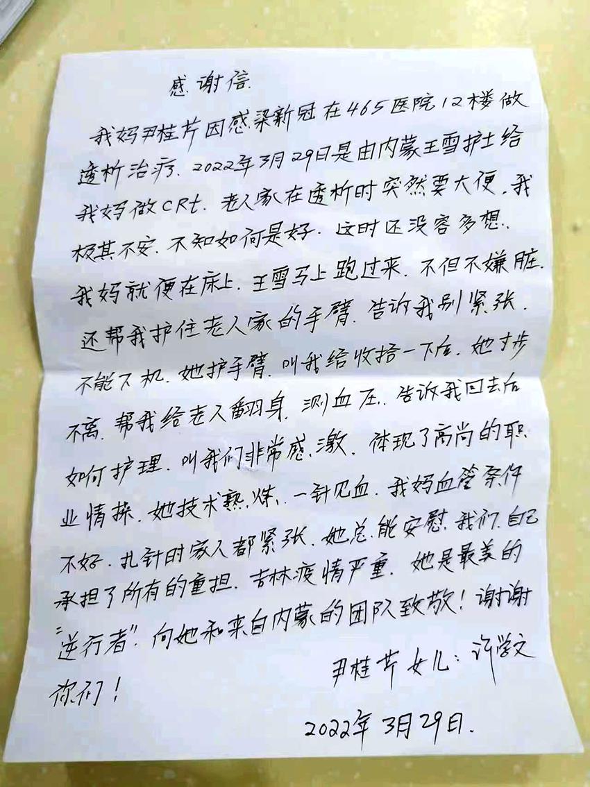 人民網長春4月6日電 (王海躍)“我媽媽做透析時突然要大便,內蒙的護士王雪不僅不嫌棄,還趕快上前幫忙護住老人的手臂……她是最美的‘逆行者’,向她和來自內蒙的團隊致敬!”3月29日,內蒙古援吉醫療總隊收到一封新冠肺炎患者女兒的手寫信,信中一字一句都飽含著吉林人民對內蒙古自治區援吉醫療總隊的感激之情。