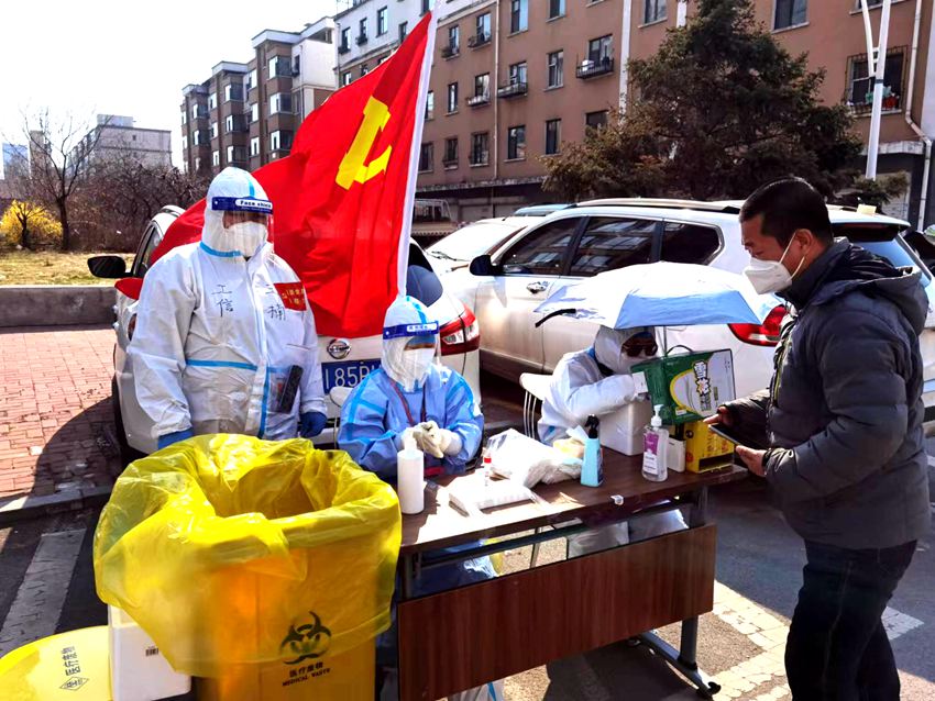 小區臨時黨支部黨員參與全員核酸檢測采樣工作。(長春市委組織部供圖)