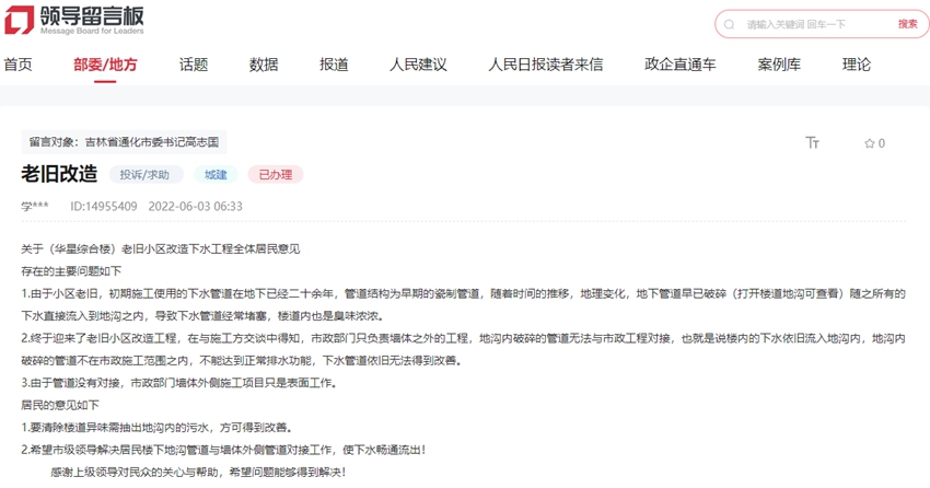老舊小區改造不僅是民生工程,也是民心工程;既與城市發展相關,更與人民福祉相連。6月,吉林省通化市人民網網友在“領導留言板”給通化市委書記留言,反映所在老舊小區改造過程中存在的一些問題。
