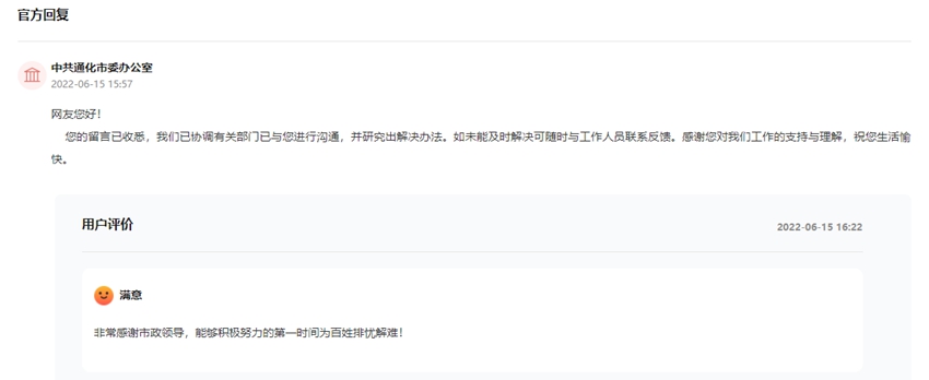 收到留言后,通化市委書記高志國高度重視,責成通化市委辦公室、通化市住建局組織相關人員第一時間到現場進行查看,了解具體問題,并由市委督查室全程跟蹤督辦?,F場勘查后,相關負責人及時聯系留言網友,詳細解釋了污水改造的相關政策規定,并提出了解決方案。