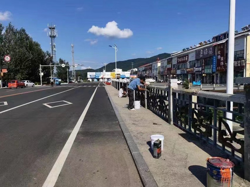 7月29日,陽光明媚。吉林省蛟河市白石山鎮內的白石山路、新華大街平坦整潔,交通標線、停車位標線色彩鮮明,路邊花池景觀帶整齊劃一……