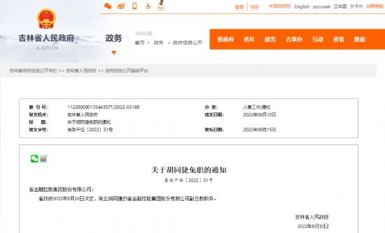 省政府2022年8月10日決定,免去胡同捷的省金融控股集團股份有限公司副總裁職務。