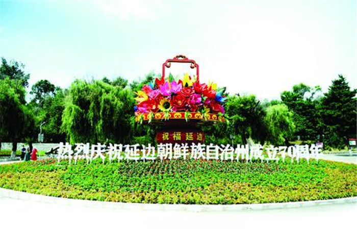 龍井市在延龍路與海蘭路交會處建起了兩處充滿朝鮮族民俗風情的鮮花立體造型,花團錦簇,姹紫嫣紅,讓人眼前一亮。