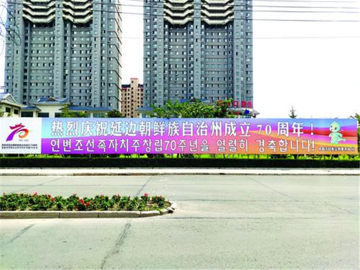 琿春市圍繞鑄牢中華民族共同體意識這一主線,按照形式多樣、全面覆蓋、注重實效的原則,分別在防川線,市區東、西、南、北、中線的交通主干道擎天柱及建筑圍擋上制作安裝了延邊朝鮮族自治州建州70周年相關宣傳標語、廣告牌。