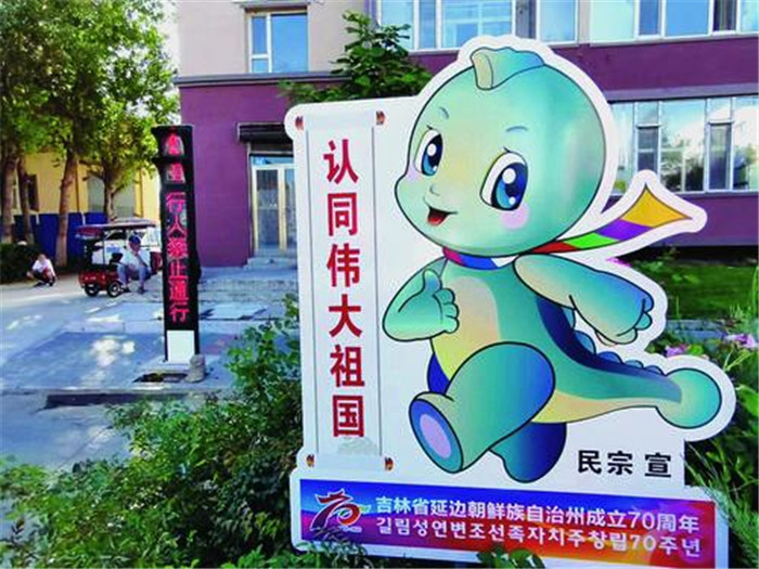 圖們市以鑄牢中華民族共同體意識為主題,制作了大型戶外廣告;以“五個認同” 為主題,設立延邊朝鮮族自治州建州70周年吉祥物“龍龍”人形立牌26處。