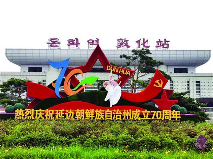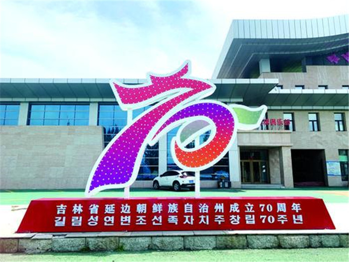 和龍市在體育場門前建起延邊朝鮮族自治州建州70周年主題標志立體造型。