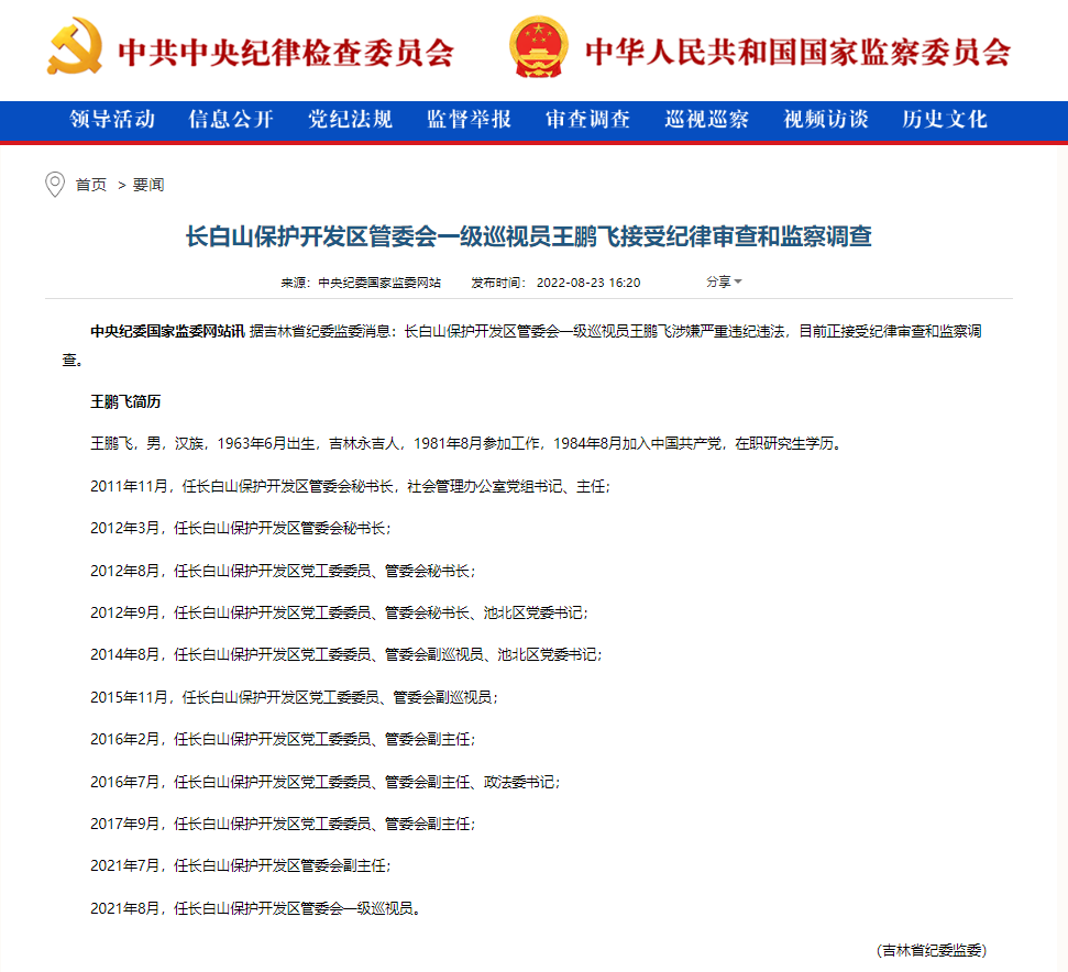 長白山保護開發區管委會一級巡視員王鵬飛接受紀律審查和監察調查