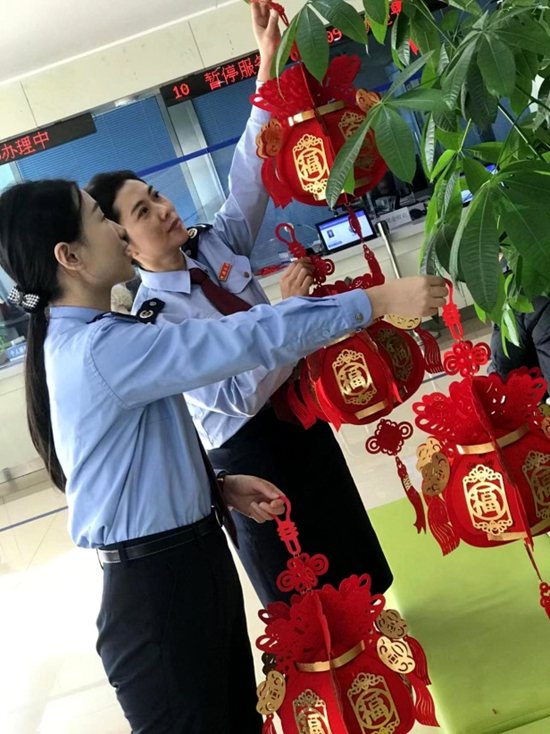 吉林高新技術產業開發區稅務局辦稅服務廳掛上新年紅燈和中國結,張燈結彩喜迎兔年。