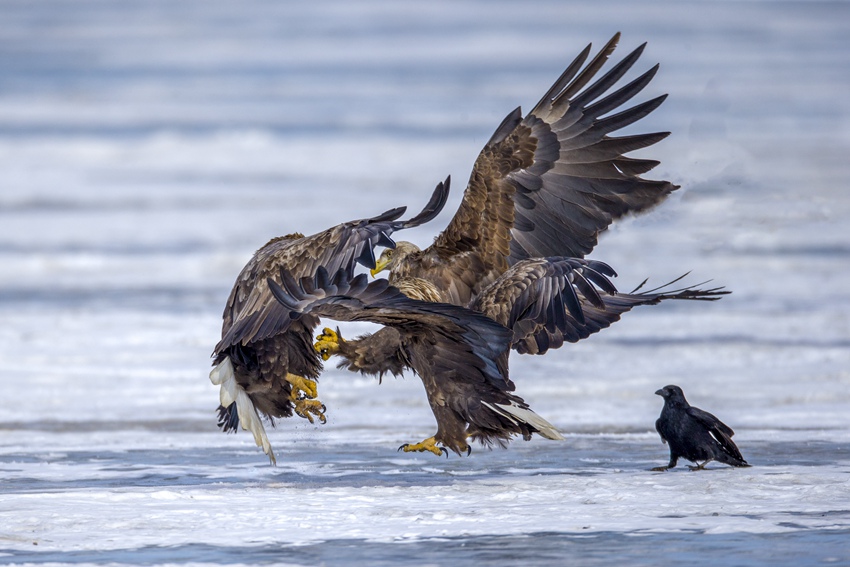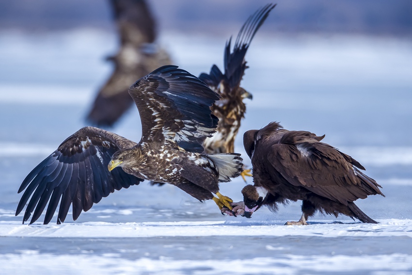 “你看冰面上投喂的食兒,海鷗先過來吃,看它吃沒事,白尾海雕、虎頭海雕再搶它嘴里的,多有意思?!痹诰葱艥竦?,我們遇見了年近70歲的谷寶臣,他架著相機,靜靜捕捉遠處飛禽的動態,全然不顧呼嘯的寒風。