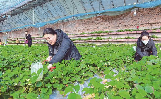 近年來,長春市九臺區堅持農旅融合,大力發展觀光采摘業,全面推進鄉村旅游業發展。圖為游客在九郊街道聶家村的草莓大棚內采摘草莓。 (記者 張野 攝)