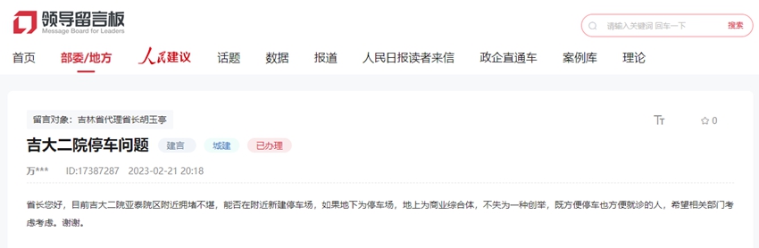 人民網長春4月4日電 (王海躍)“停車難”一直是群眾看病就醫的煩心事、操心事。針對吉大二院“停車難”的問題,吉林網友在“領導留言板”給吉林省省長留言,提出了在醫院附近新建停車場的建議:“省長您好,目前吉大二院亞泰院區附近擁堵不堪,能否在附近新建停車場……既方便停車也方便就診的人,希望相關部門考慮考慮。謝謝?!?/p>