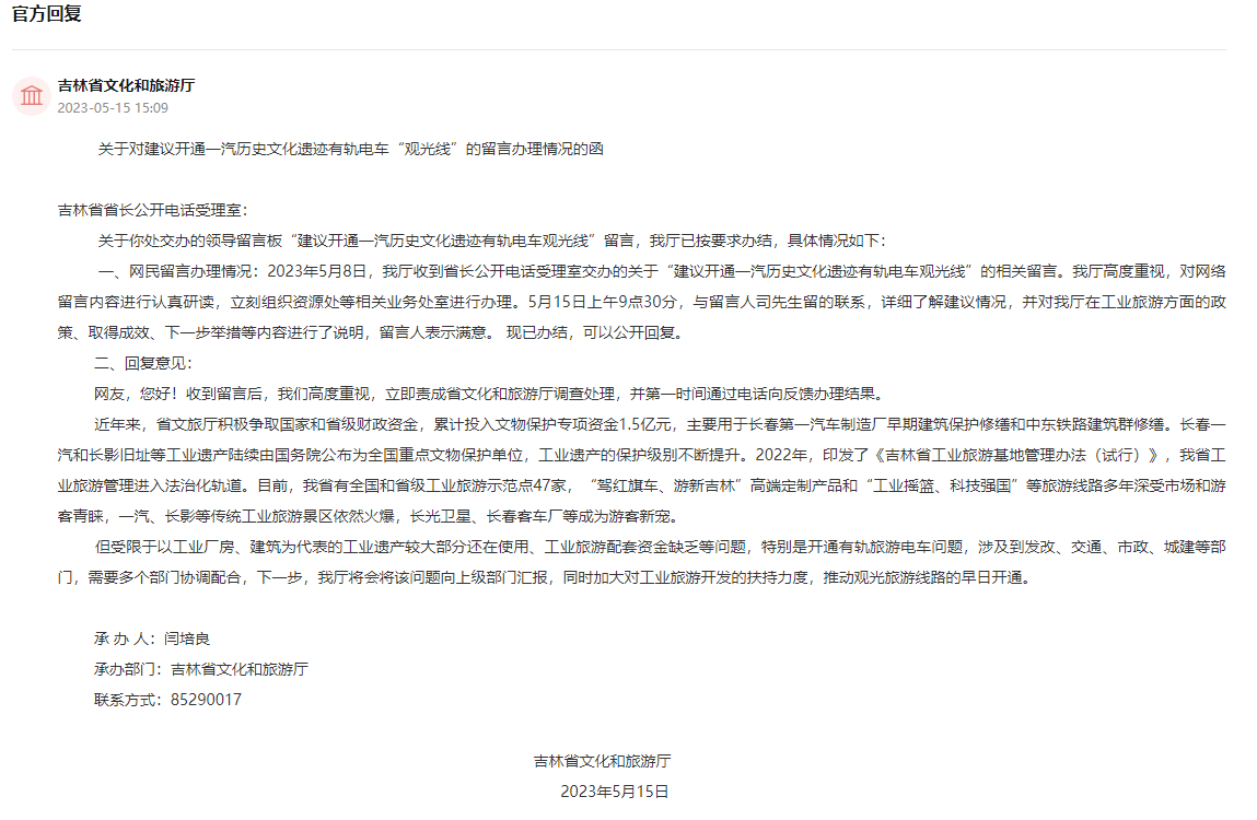 該留言引起了吉林省文旅廳的高度重視,不但對留言內容認真研讀,還立刻組織資源處等相關業務處室與司先生取得聯系,詳細了解建議情況,并對文旅廳在工業旅游方面的政策、取得成效、下一步舉措等內容進行了說明。