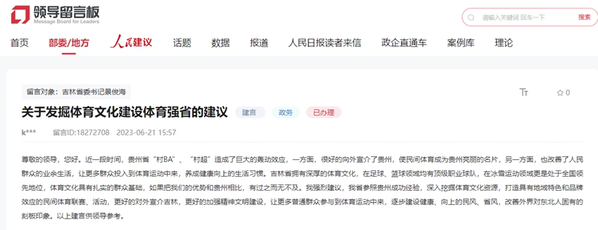 有回音丨網友建議參照“村BA”成功經驗建設體育強省 吉林:電話聊一聊