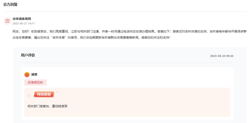 吉林省體育局第一時間與網友進行電話交流,并回復稱:“吉林省每年都會開展很多群眾性體育賽事,建議您關注‘吉林體育’抖音號,我們會定期更新吉林省群眾體育賽事等新聞?!?/p>