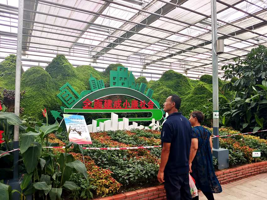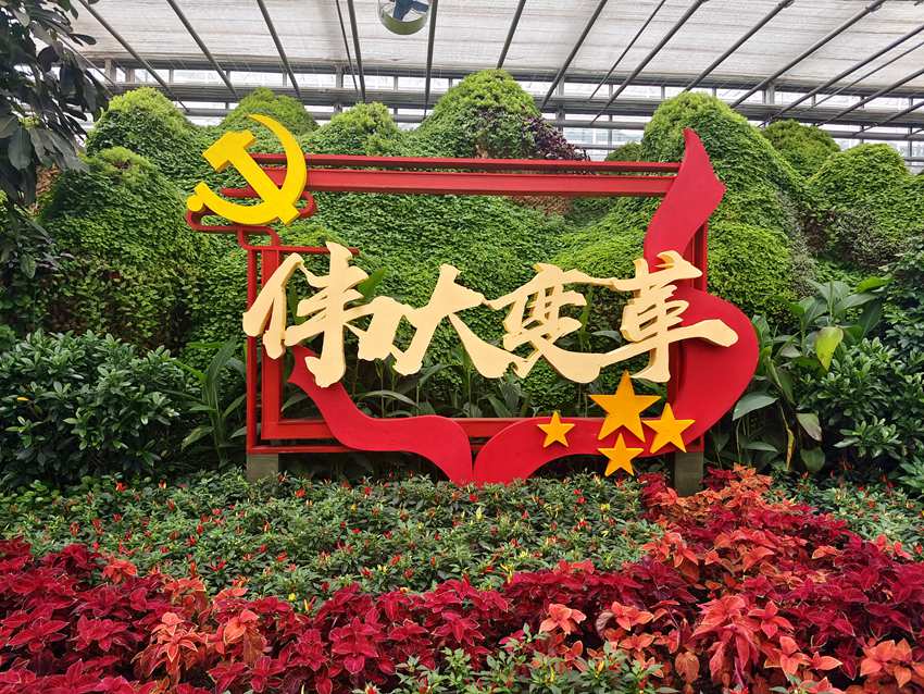 進入“強國之路”展廳,“以中國式現代化全面推進中華民族偉大復興”幾個大字為整個展館奠定了主基調。今年,新時代創意展廳主題為“強國之路”,主要以黨的二十大精神為主要展示內容,展示我國過去十年取得的成就。進入到展廳內部,“偉大變革”“全面建成小康社會”“美麗中國”等關鍵字和綠植農作物組成的景觀顯示著國家的強大,“青春有我”“聽黨話、感黨恩、跟黨走”“堅持黨的領導”等內容穿插其中,組成共30組景觀,讓大家在游覽中了解到更多祖國的發展變化。