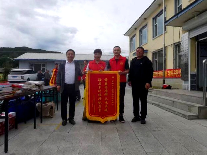 吉林省委宣傳部派駐十八道溝村第一書記趙長江、村黨支部書記陳軍代表向愛心企業贈送“情系困難群眾送溫暖 助力鄉村振興獻力量”的錦旗,感謝企業的真心幫扶、愛心奉獻。(任林楠 郭琳)