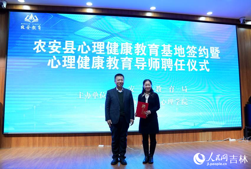 簽約儀式上,農安縣教育局向東北師范大學附屬中學高中部副校長劉玉新,頒發農安縣中小學、幼兒園心理健康教育導師聘書。