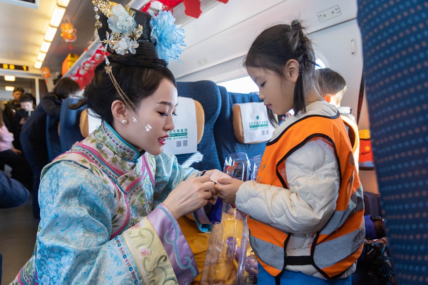 1月7日上午10時,長春客運段值乘的哈爾濱西至吉林D124次列車接到了11位來自南方的“小砂糖橘”。年味十足的裝扮,特色的拉花、燈籠飾品,讓“小砂糖橘”一上車就感受到了地道大東北的熱情和濃厚年味。