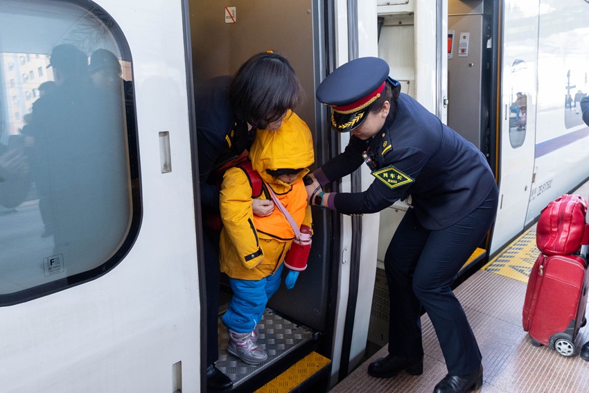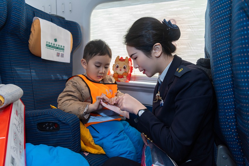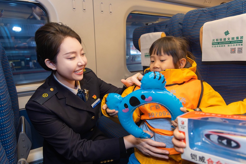 該段動車四隊5名青年志愿者也來到了列車上,和值乘班組共同開展了“愛心護苗”活動,為小旅客送水,抬放行李,一路暖心護送?!皷|北旅游熱爆火后,南方來的游客日漸增多,我們班組準備了暖寶寶、女士貼等服務備品和治療骨傷噴劑,隨時為有需要的旅客提供?!盌124次列車長胡慧敏說。為了做好此次11名小旅客出行順利,她不但提前組織班組乘務人員將小旅客接到列車上,妥善安頓,重點照顧,還聯系了吉林站提供綠色出站服務,全力以赴為游客們提供溫馨旅程。(潘潔)