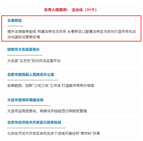長春新區憑借“提升法律服務能級 構建法務生態體系 長春新區以智慧法務區為依托打造市場化法治化國際化營商環境”入圍法治化優秀案例,優化營商環境工作再獲肯定。