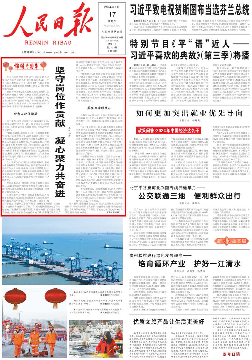 在二〇二四年新年賀詞中,習近平總書記指出:“各行各業的人們都在揮灑汗水,每一個平凡的人都作出了不平凡的貢獻!”氣象萬千的新春圖景,有闔家團圓的喜悅,更有堅守崗位的奉獻與奮進。