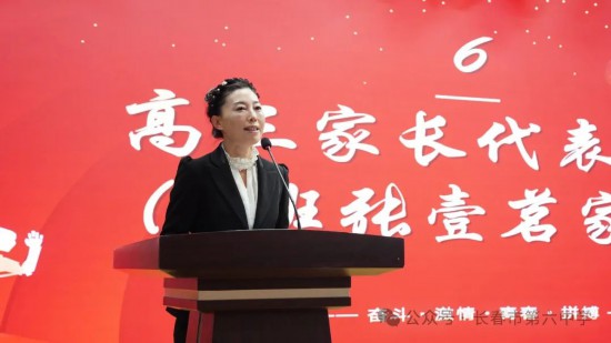 高三學生張壹茗的母親作為家長代表發言。她首先代表2024屆學生家長對學校領導和老師們表示崇高的敬意和衷心的感謝。勉勵每一位孩子咬定目標、堅持到底,為高中生活畫上圓滿的句號,讓青春留下無悔的印記。