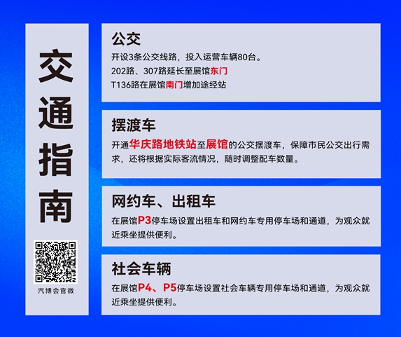 為方便廣大市民觀展,共有202、307、136三條公交專線延長了運行線路,在展館入口設置站點。展館周邊規劃設置了網約車??奎c位和5處停車場。同時,在地鐵一號線、六號線的華慶路站和博覽中心入口處,設置了擺渡車,觀眾可乘坐擺渡車往返地鐵與展館。
