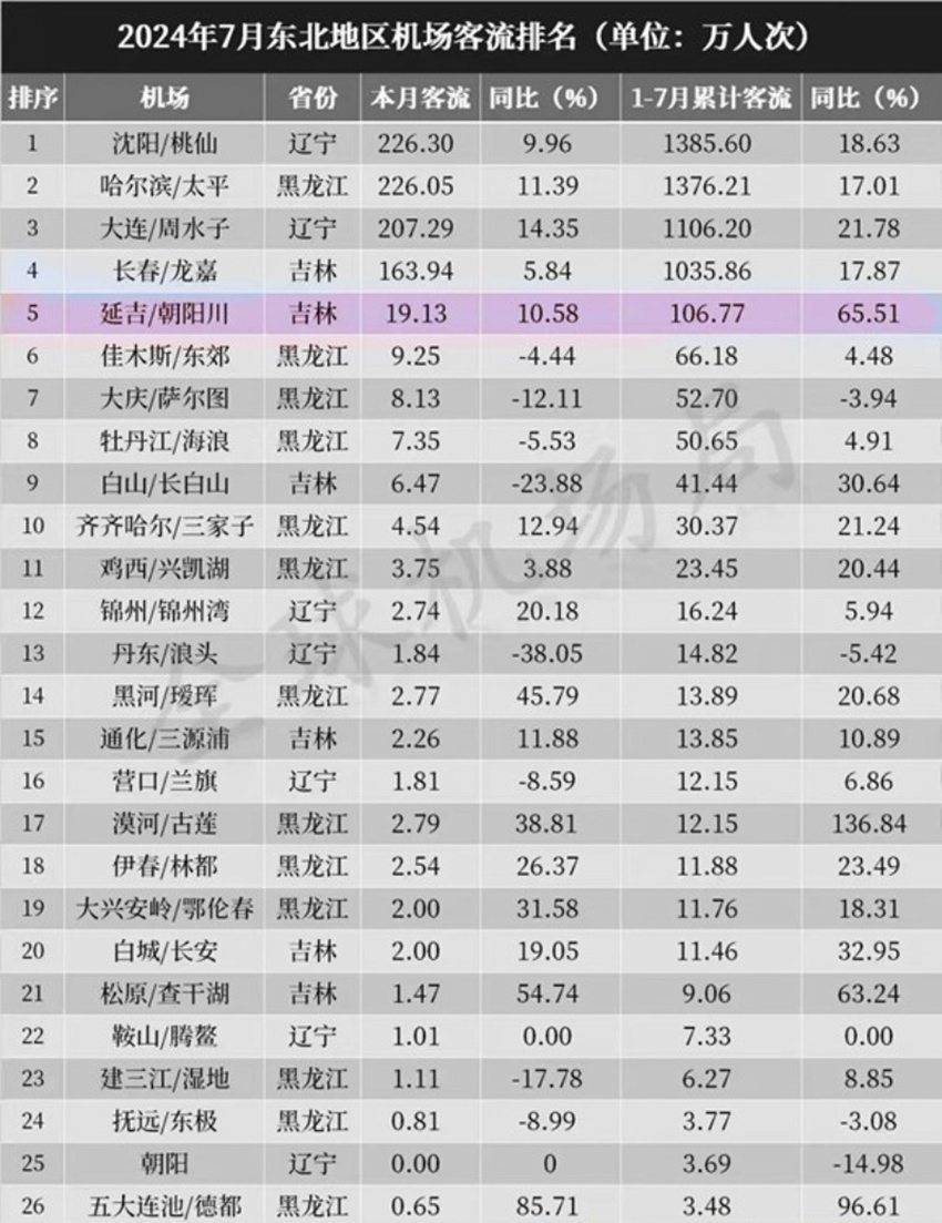 東北地區機場1—7月客流數據公布,支線機場延吉排名第一!