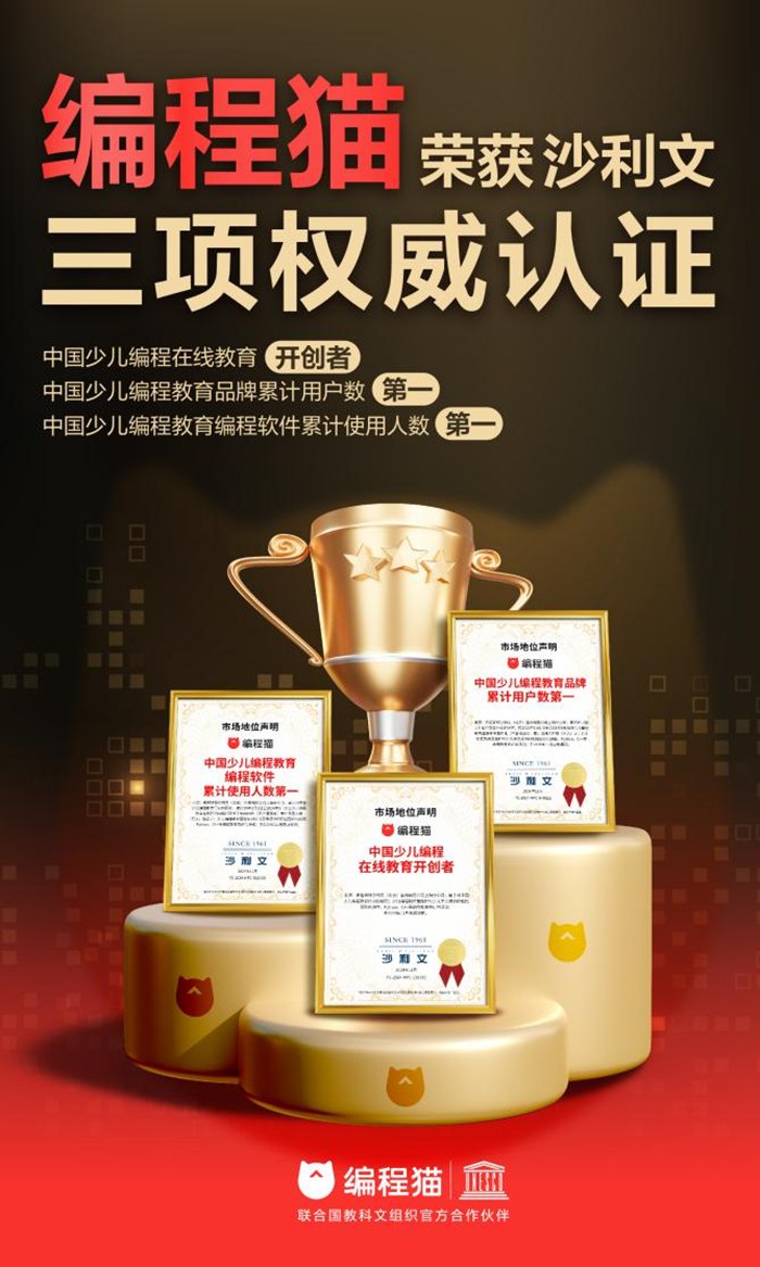 此次授予編程貓的權威認證,是沙利文團隊基于對中國少兒編程教育行業進行深入研究做出的市場地位聲明確認,客觀真實地反映了市場和用戶對編程貓的認可,意味著在中國少兒編程教育行業,編程貓既是在線編程教育開創者,其用戶數和編程軟件使用人數也是遙遙領先,穩居行業頭部地位。